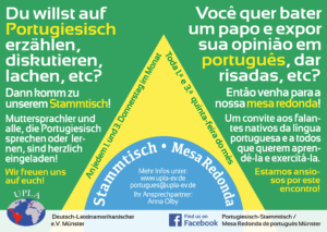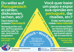 Aufgrund der Semesterferien findet der nächste Portugiesisch-Stammtisch erst am 15. März statt. Wir treffen uns ab 19:30 Uhr im F24 um in gemütlicher Runde auf portugiesisch zu plaudern. Muttersprachler und alle, die Portugiesisch sprechen oder lernen, sind herzlich eingeladen!