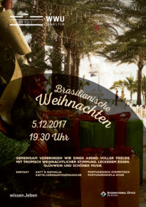 Bom dia queridos! An dieser Stelle möchten wir euch gerne einladen zur Brasilianischen Weihnachtsfeier, die wir gemeinsam mit der Brasilidade organisieren! Das Ganze findet am Dienstag, den 05.12. ab 19:30 Uhr in der Brücke (Wilmergasse 2) statt. Was wir genau ausgeheckt haben, seht ihr auf dem angehängten Flyer. Wir freuen uns schon auf euch!